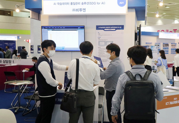비투엔은 최근 코엑스에서 개최된 '2021 ICT 기술사업화 페스티벌'에 참가해 'SDQ for AI'를 선보였다. 사진은 비투엔 전시부스 상담 현장.