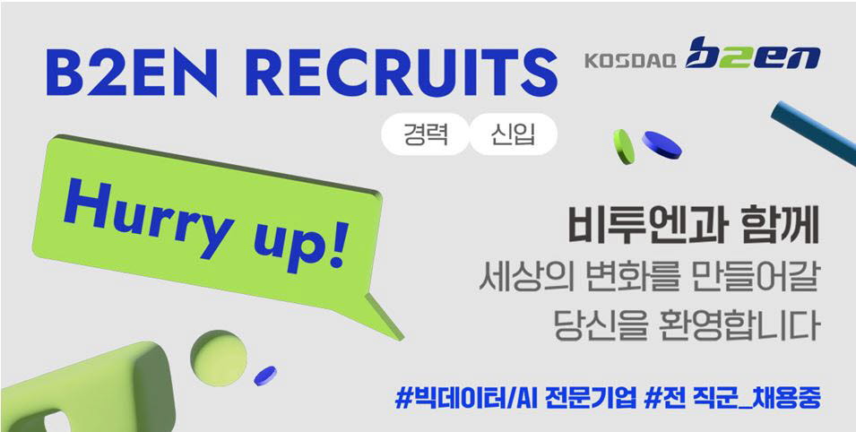 국내 데이터 산업을 선도하고 있는 빅데이터, 인공지능(AI), 데이터 솔루션 전문 기업 비투엔(307870, 대표이사 조광원)이 2022년 상반기 경력/신입 공개 채용을 진행한다고 14일 밝혔다. ‘데이터로 더 안전하고 편리하게 행복한 세상’을 만들며 고 부가가치를 창출해 가기 위한 우수 인재 확보를 통해 기술 역량을 고도화하고 신규 사업의 성장 동력을 강화한다는 계획이다.
