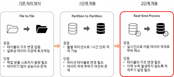 하나, 빅(Big) 데이터를 잘게 쪼개는 파티션(Partition) 기법을 적용하자. 둘, 데이터를 실시간 처리함으로써 적재 부하를 최소화하자. 이런 전략으로 데이터를 파티션화해 ‘데이터 접근(Data Access) 부하’를 최소화하고, 실시간 처리를 이용해 ‘데이터 적재(Data Upload) 부하’ 또한 낮춰 성능 이슈를 완전히 해결할 수 있었다.