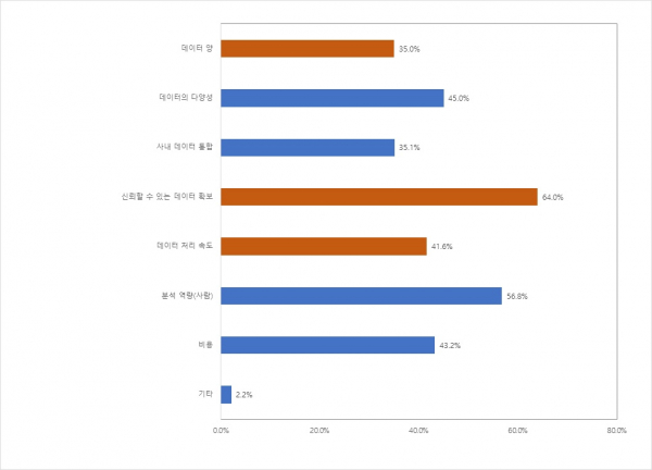 [그림 1]에서 볼 수 있듯이 빅데이터 프로젝트를 추진할 때 어려움으로 ‘신뢰할 수 있는 데이터 확보(64.0%)’, ‘데이터 처리 속도(41.6%)’, ‘데이터 양(35%)’이 주요 원인으로 나타났다. 우리가 인지해야 하는 것은 ‘데이터 확보의 한계’뿐만 아니라 ‘데이터 양에 대한 한계’, ‘처리 성능에 대한 한계’ 등 데이터의 특성과 연관성이 높은 것들이다. 결국 정확한 데이터의 특성을 파악하고 그 특성에 맞는 대처가 필요하다.