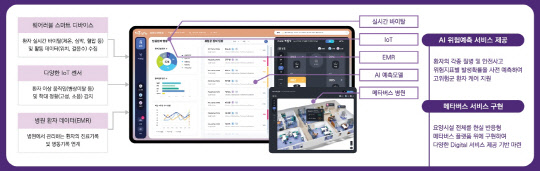 요양병원용 '늘 실버케어'는 체온, 심박수, 혈압, 호흡수, 산소포화도 등 요양병원 환자의 실시간 생체정보와 위치, 걸음수 등 활동정보에 고성, 소음 등 비상상황 감지 정보를 결합해 마치 현장에 있는 것처럼 상황을 낱낱이 읽는 데서 출발한다. 여기에 병원 IT 시스템에 축적된 환자의 의무기록 정보까지 연결해 AI 알고리즘을 바탕으로 낙상, 급작사, 감염 등을 예측해 만일의 사고를 예방할 수 있도록 돕는다. 환자들은 웨어러블 장치를 부착하고 요양시설에는 IoT 센서가 설치된다. 손목 밴드 형태의 웨어러블 장치는 실시간 생체정보와 위치·활동량 정보를 수집해 환자 위험 진단을 위한 정보로 활용한다.