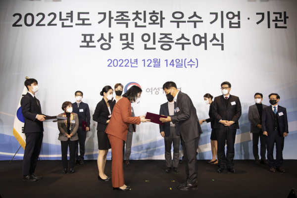 특히 회사는 가족친화문화 확산을 위해 유연근무제를 활용한 근무시간의 자율 조정, 출산 및 육아휴직 장려, 출산 및 돌 선물 제공, 자녀 학자금 지원, 주택자금 대출 이자 지원, 선택적 복리후생을 위한 연간 500만원 이상의 포인트 제도 등을 운영하고 있다.