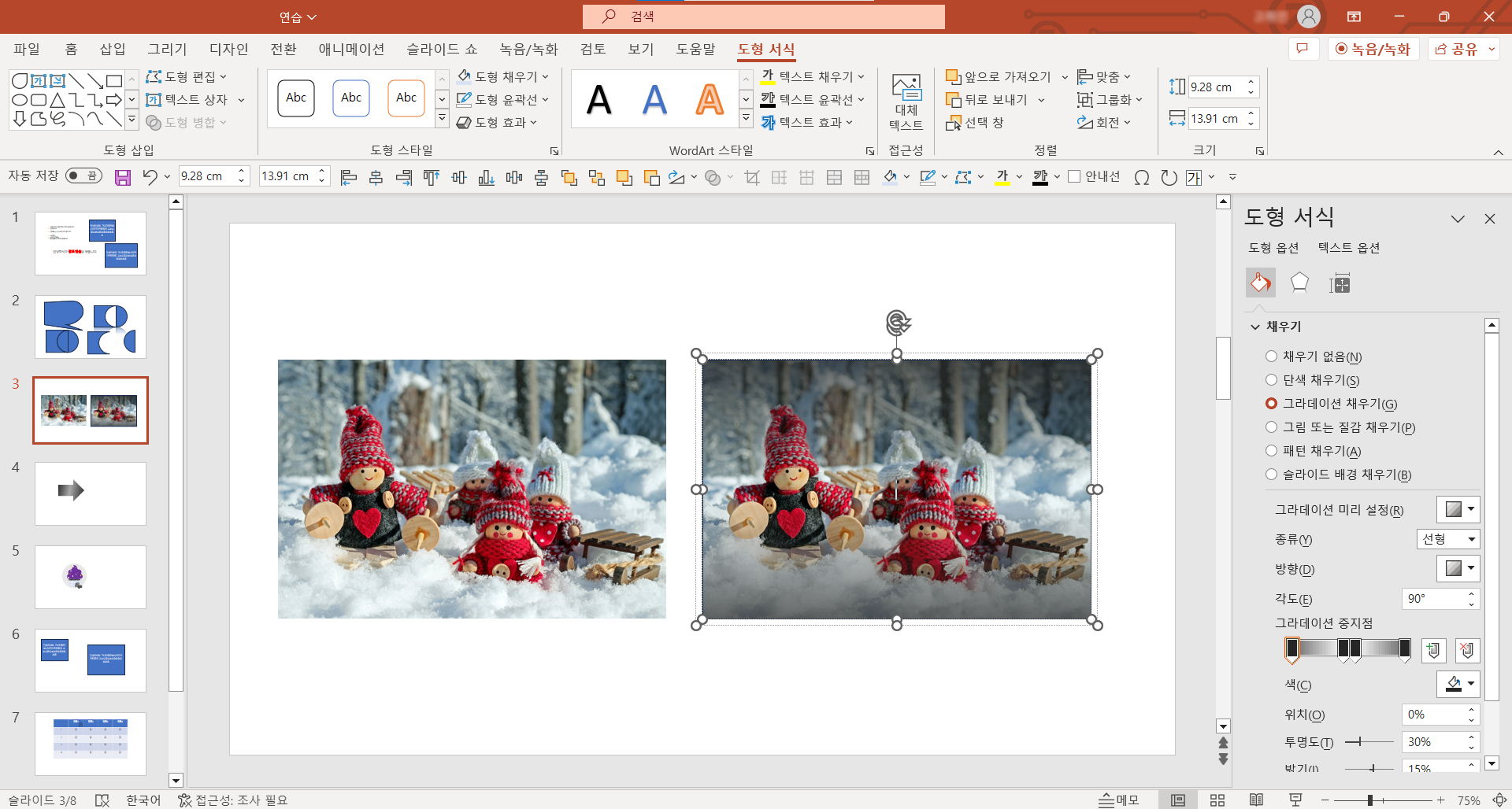 3) 검정색 네모박스의 도형 서식에 들어가서 채우기 -> 그라데이션 채우기 체크