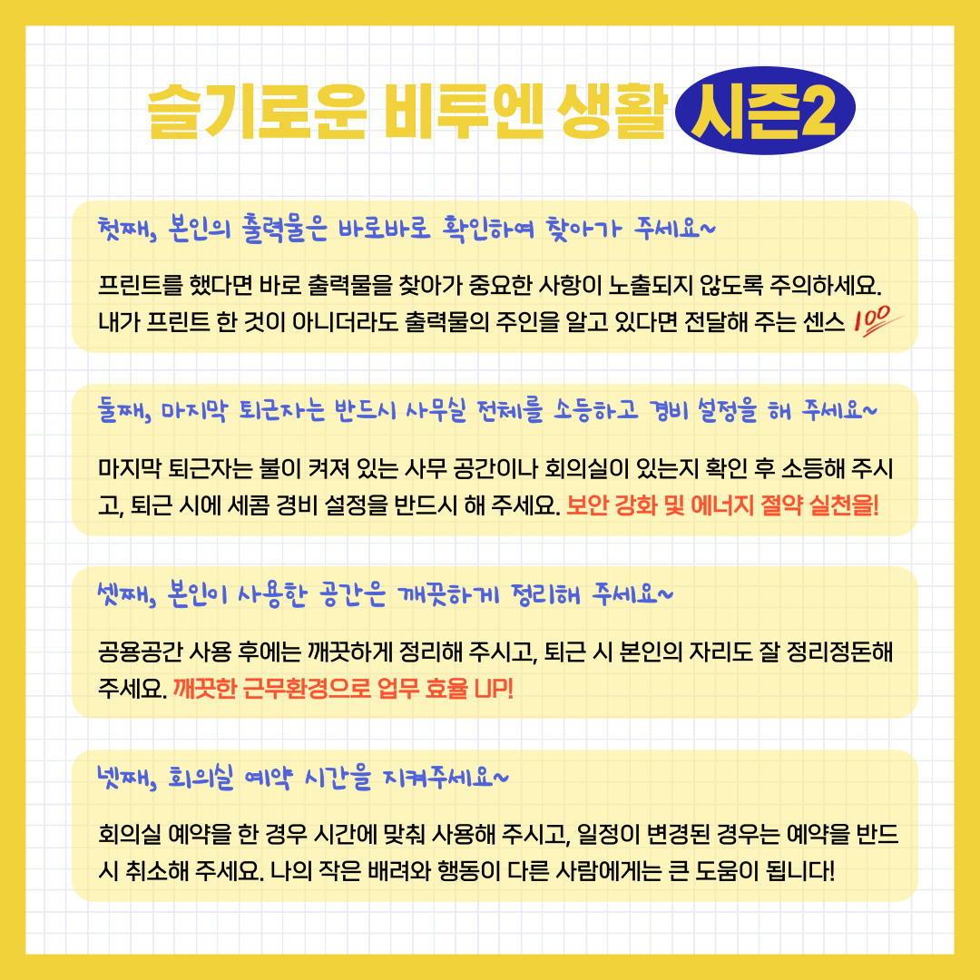 회사 생활에 있어 서로 조금만 더 신경 쓰고 상대방을 배려한다면, 훨씬 더 재미있는 워크라이프를 운영할 수 있습니다.