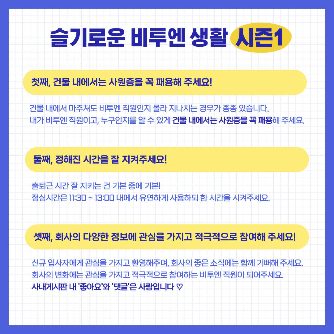 많은 분들께서 슬기로운 비투엔 생활 가이드 살펴보시고 올바르고 건강한 직장문화를 만들어 가시길 바랍니다!