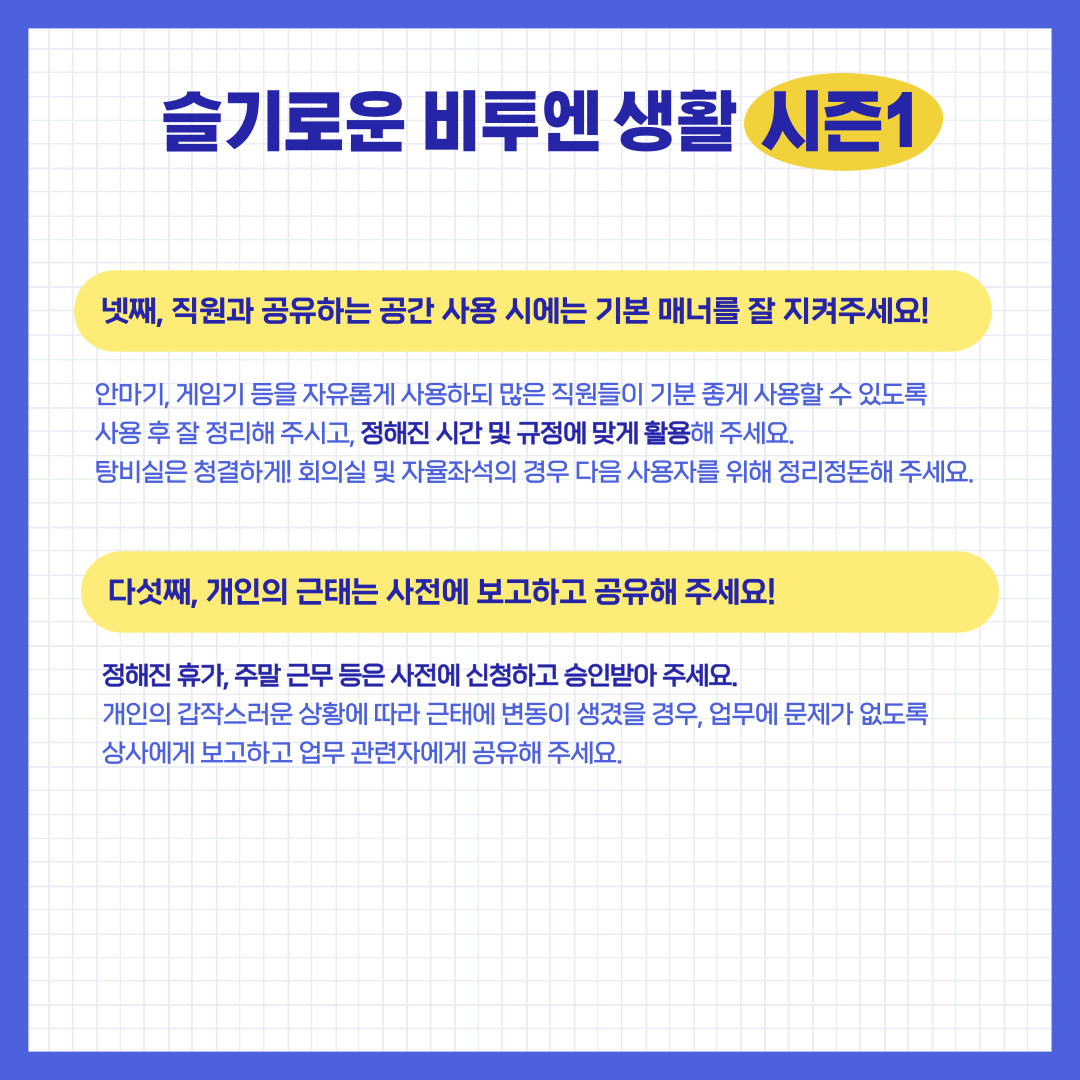 회사 생활에 있어 서로 조금만 더 신경 쓰고 상대방을 배려한다면, 훨씬 더 재미있는 워크라이프를 운영할 수 있습니다.