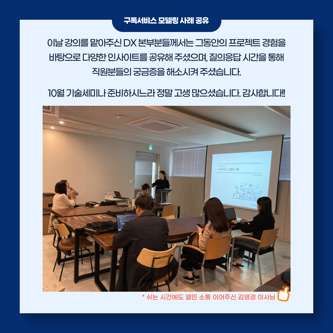 금번 10월 기술세미나는 '구독서비스 모델링 사례 공유'라는 주제로 DX 본부 임직원분들께서 열강을 펼쳐 주셨습니다.