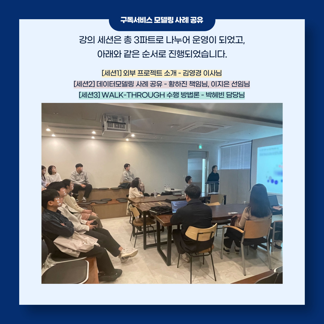 '구독서비스 모델링 사례 공유' 세미나는 아래와 같은 순서로 운영되었으니 참고해 주세요😊