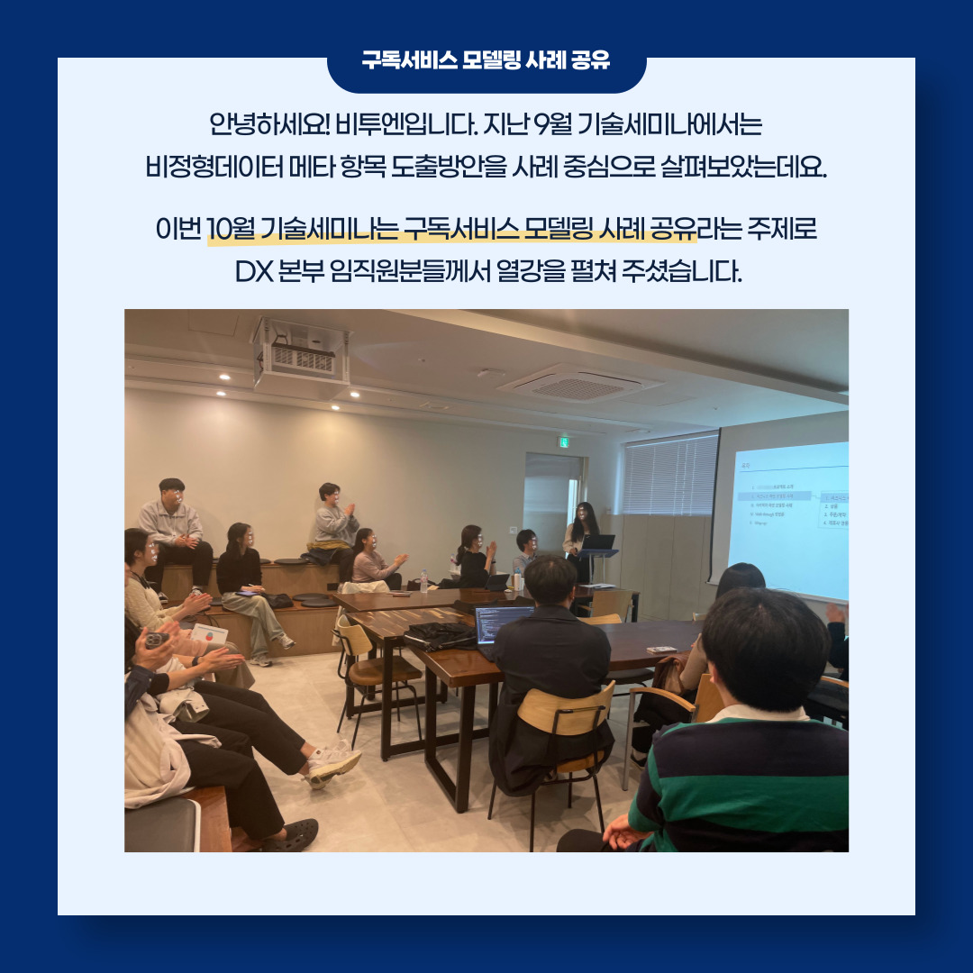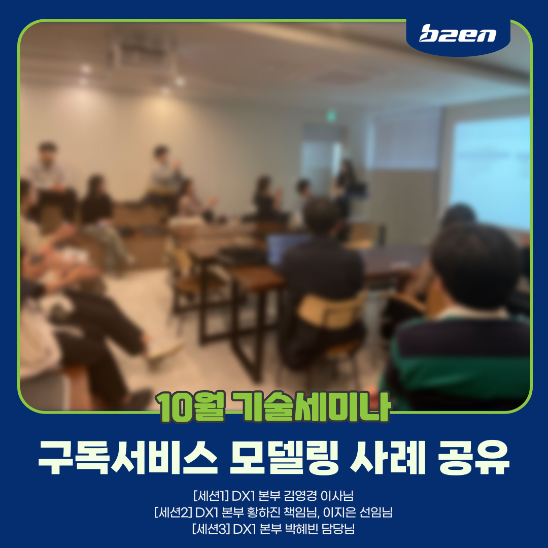 금번 10월 기술세미나는 '구독서비스 모델링 사례 공유'라는 주제로 DX 본부 임직원분들께서 열강을 펼쳐 주셨습니다.