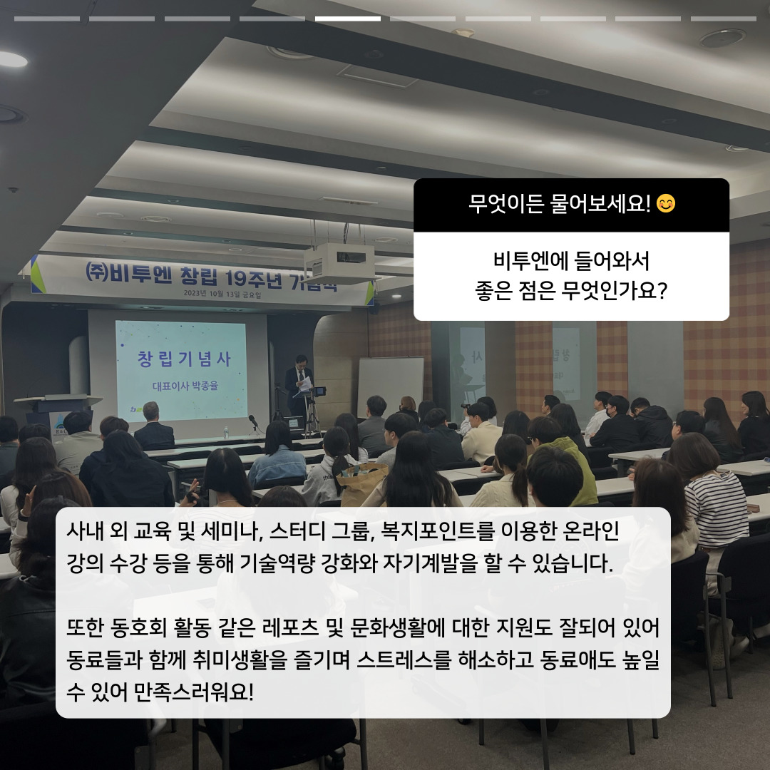 이재석 선임님께서 하시는 업무는 무엇이고, 선임님께서 바라보시는 비투엔은 어떤 기업일지 함께 알아보시죠😎