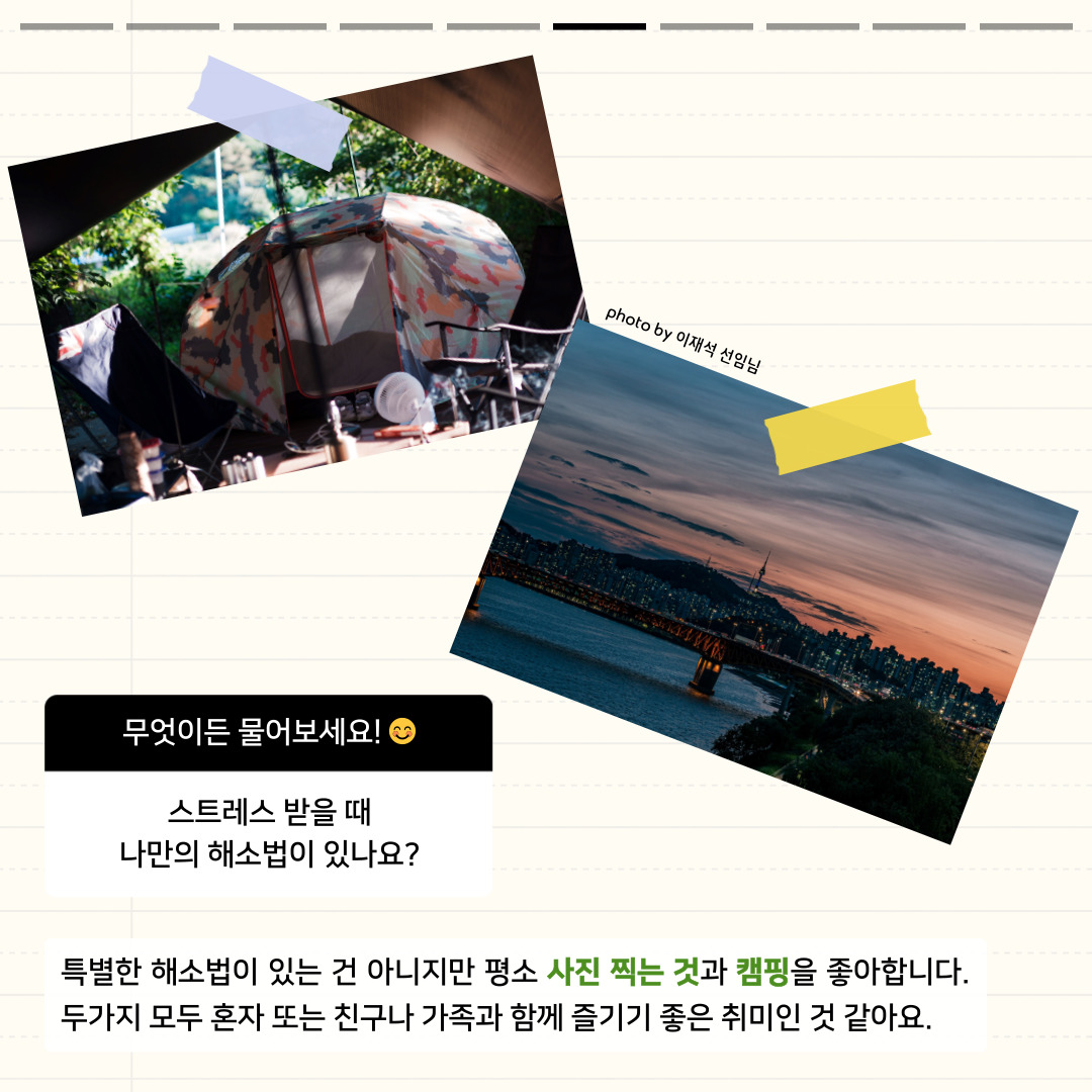 특별한 해소법이 있는 건 아니지만 평소 사진 찍는 것과 캠핑을 좋아합니다. 두가지 모두 혼자 또는 친구나 가족과 함께 즐기기 좋은 취미인 것 같아요.