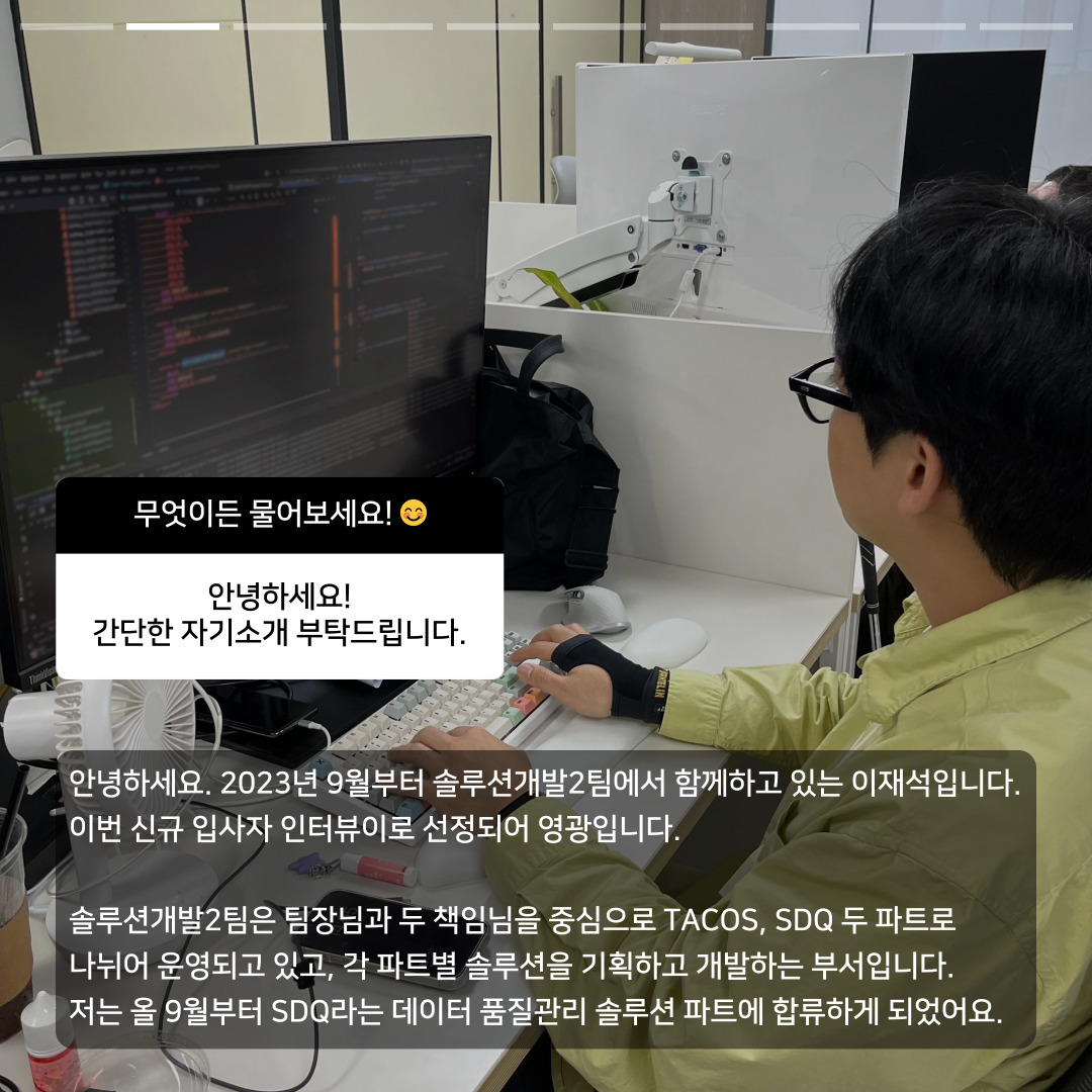 안녕하세요. 2023년 9월부터 솔루션개발2팀에서 함께하고 있는 이재석입니다.