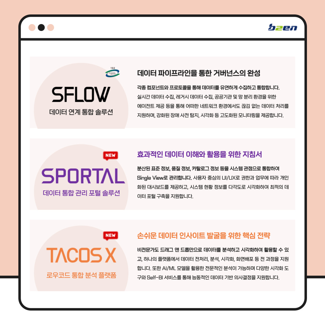 여기에 ‘SMETA(에스메타)’, ‘SDQ(에스디큐), ‘SFLOW(에스플로우)’ 등 마침내 완성된 비투엔의 솔루션 라인업을 한번에 만나보실 수 있습니다.
