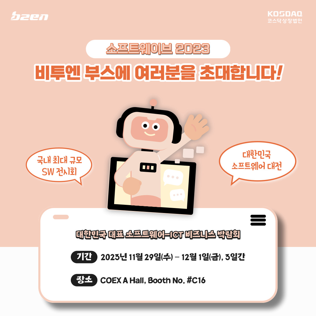 | 소프트웨이브2024 비투엔 부스에 여러분을 초대합니다! (0) | 2024.11.14 |
