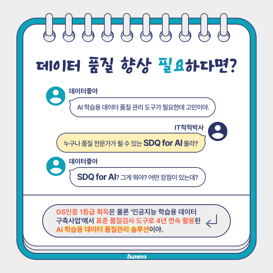 누구나 품질 전문가가 될 수 있는 SDQ for AI와 함께 AI 학습데이터의 체계적인 품질관리를 통해 고품질 AI 학습 데이터 확보의 기틀을 마련하세요!
