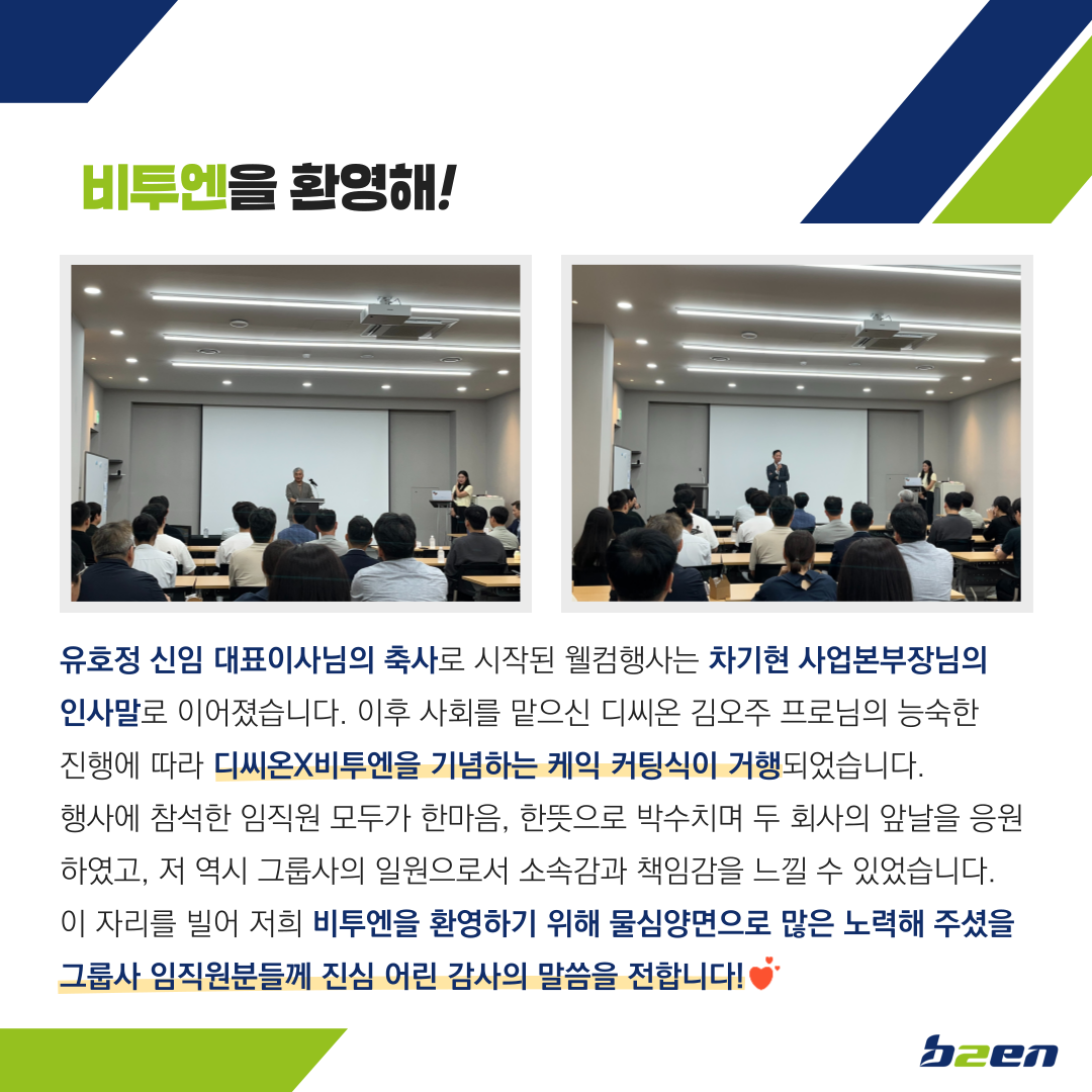 특히 행사에 참석한 전사 임직원 모두가 한마음, 한뜻으로 박수치며 디씨온과 비투엔의 앞날을 응원해 주셔서, 저 역시 그룹사의 일원으로서 소속감과 책임감을 느낄 수 있었습니다!