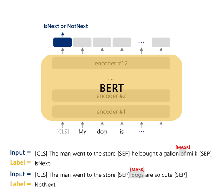이렇게 다음 문장이 문맥상 올바른 문장인지 예측하는 학습을 진행할 때는 앞서 설명 드린 MLM의 형태로 입력이 들어가서 MLM과 NSP가 함께 수행됩니다.