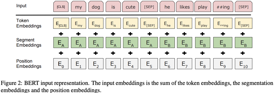 이와 더불어 [SEP] 토큰 이전 문장을 sentence A, [SEP] 토큰 이후 문장을 sentence B로 취급해서 문장을 구분해주는 것을 segment embeddings이라고 합니다.