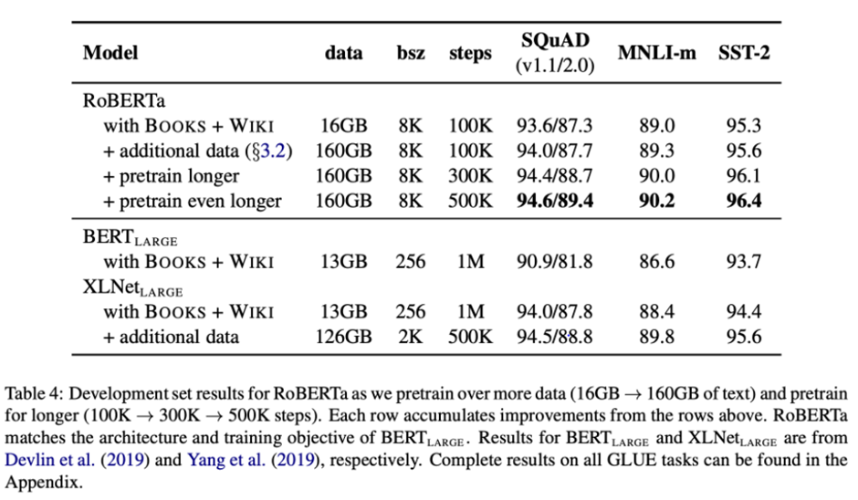 논문 저자는 BERT가 undertrain 되어있기 때문에 이전에 간과했던 부분의 접근을 달리하면, 이후에 발표된 모든 모델의 성능과 일치하거나 초과할 수 있음을 발견했다고 합니다.