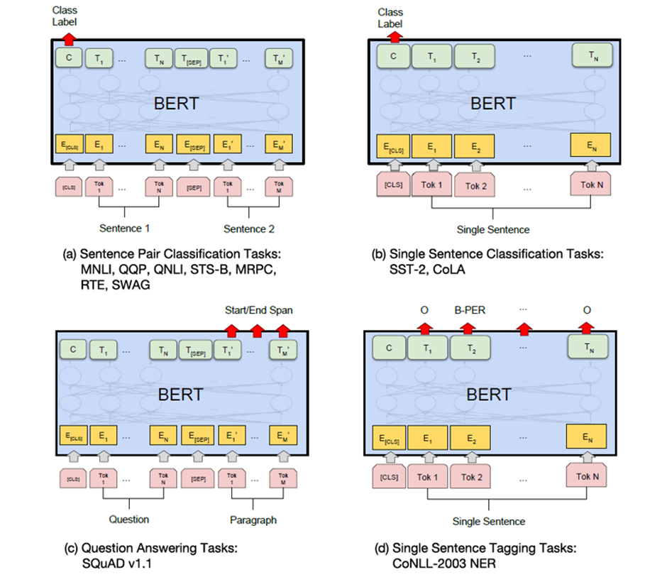 BERT는 앞에서 설명한 MLM, NSP 두 가지의 pre-training 과정을 거친 모델을 가지고 제일 위에 단 하나의 layer를 쌓는 것만으로도 다양한 task에서 좋은 성능을 보입니다.