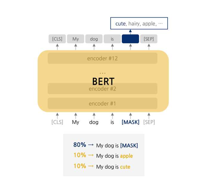 ex1) My dog is [MASK] : [MASK] 토큰을 이용하여 지우기 (80%)