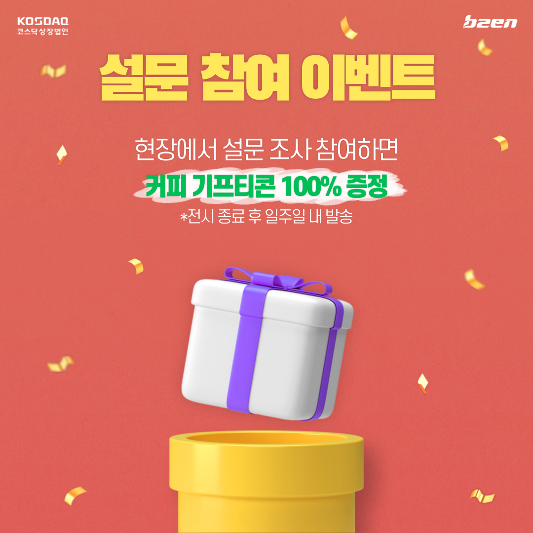 비투엔 부스 현장에서 설문 조사에 참여하시면 커피 기프티콘을 100% 증정합니다.