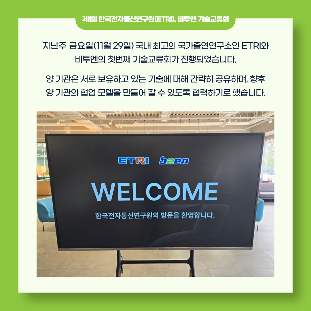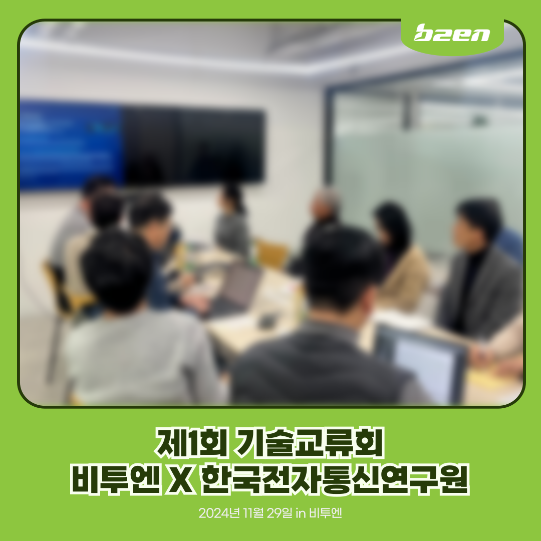 지난주 금요일(11월 29일) 국내 최고의 국가출연연구소인 ETRI와 비투엔의 첫번째 기술교류회가 진행되었습니다.