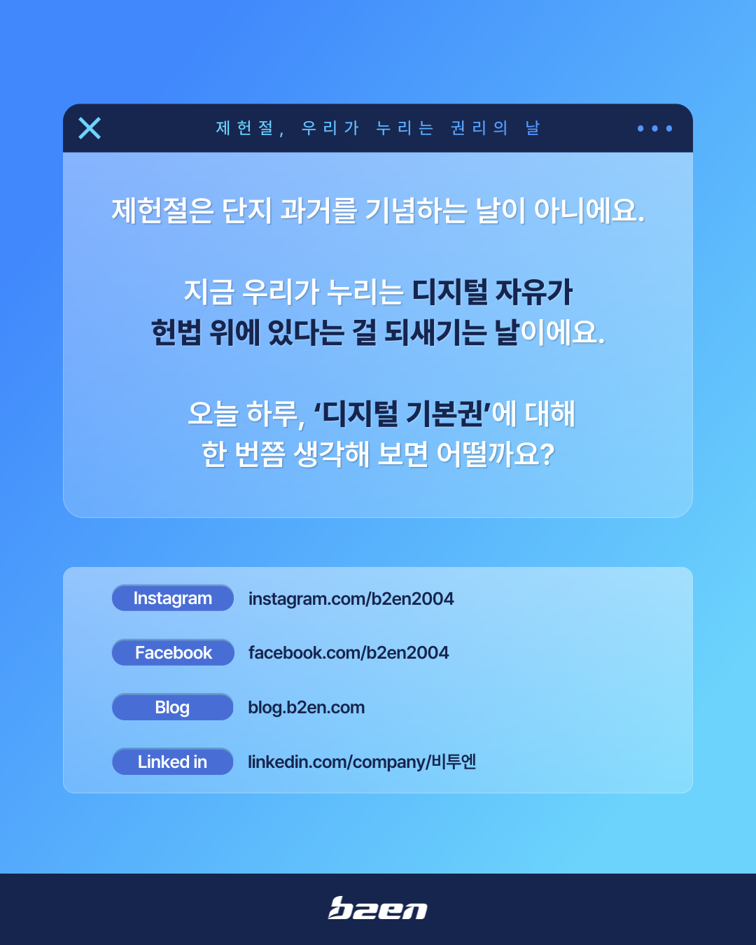 이번 제헌절, 우리가 일상 속에서 누리는 디지털 자유와 권리의 뿌리를 다시 한 번 생각해보는 계기가 되기를 바랍니다.