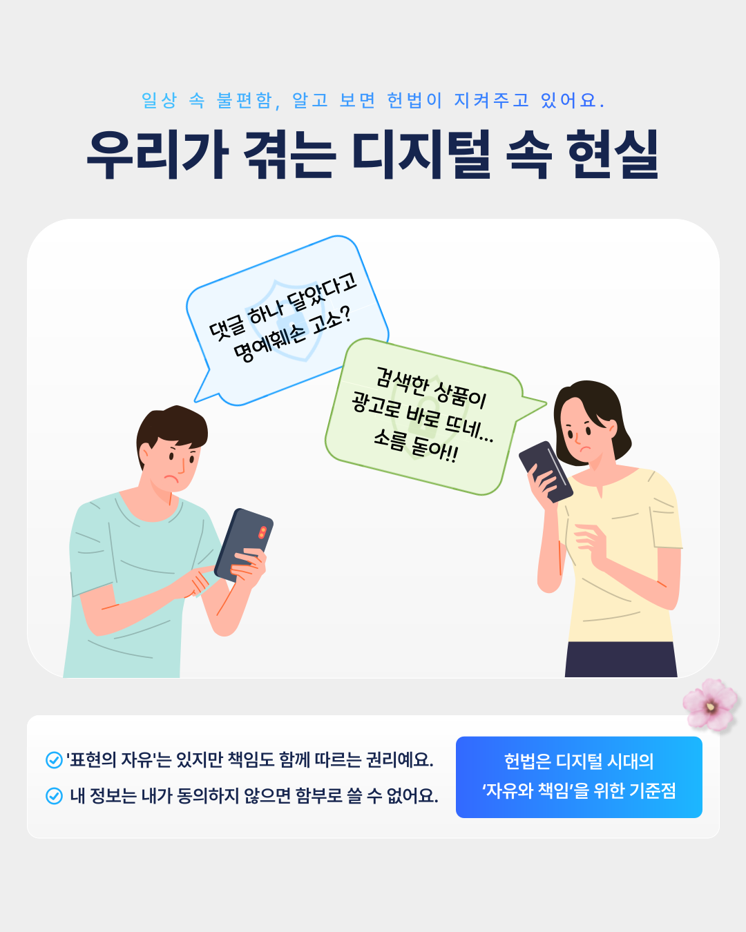 이번 카드뉴스에서는 제헌절을 맞아, 헌법과 디지털 기본권이 어떻게 연결되어 있는지 실생활 사례와 함께 소개해드립니다.