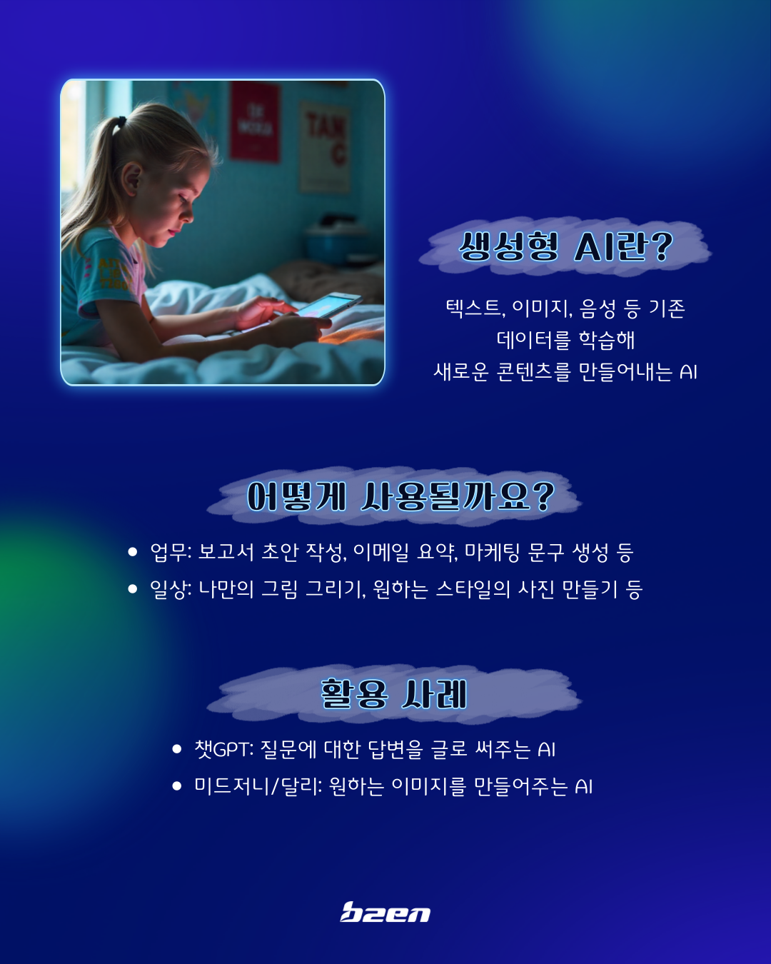 - 디자인/미술: 미드저니, 달리(DALL-E) 등으로 상상 속 이미지를 몇 초 만에 현실화