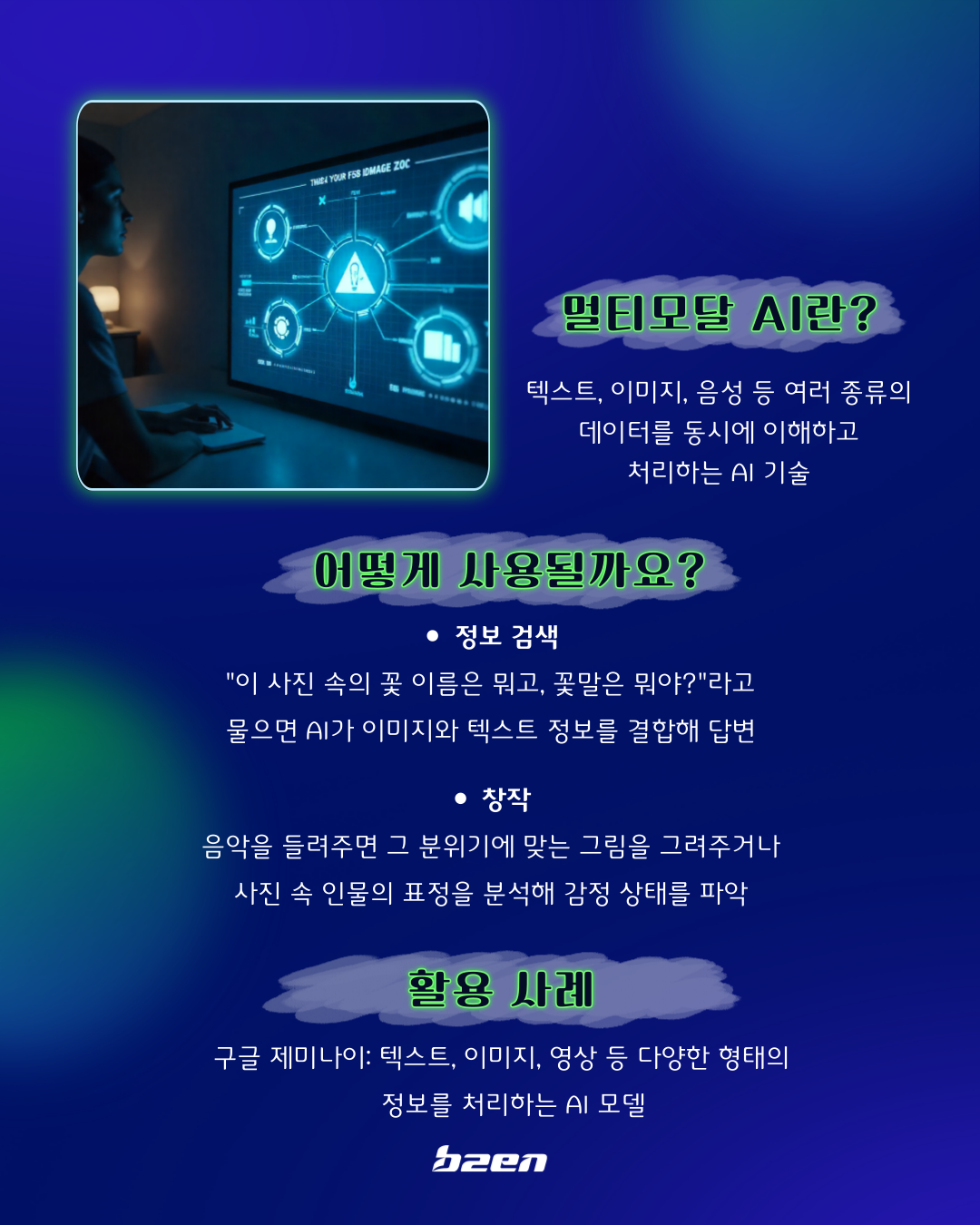 개념 설명: 인간처럼 텍스트, 이미지, 음성, 영상 등 여러 종류의 정보를 동시에 이해하고 처리하는 AI입니다.