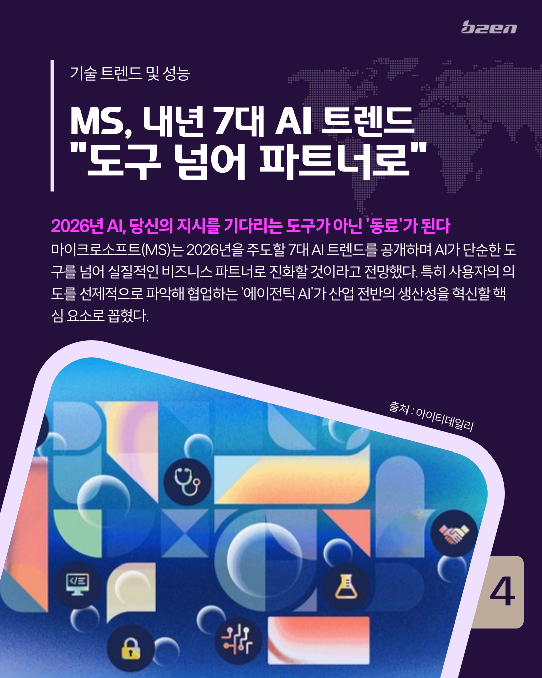 마이크로소프트(MS)는 2026년을 주도할 7대 AI 트렌드를 공개하며 AI가 단순한 도구를 넘어 실질적인 비즈니스 파트너로 진화할 것이라고 전망했다.