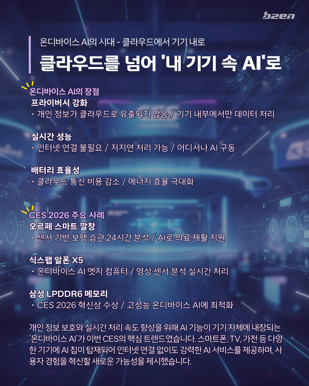 스마트폰, TV, 가전 등 다양한 기기에 AI 칩이 탑재되어 인터넷 연결 없이도 강력한 AI 서비스를 제공하며, 사용자 경험을 혁신할 새로운 가능성을 제시했습니다.