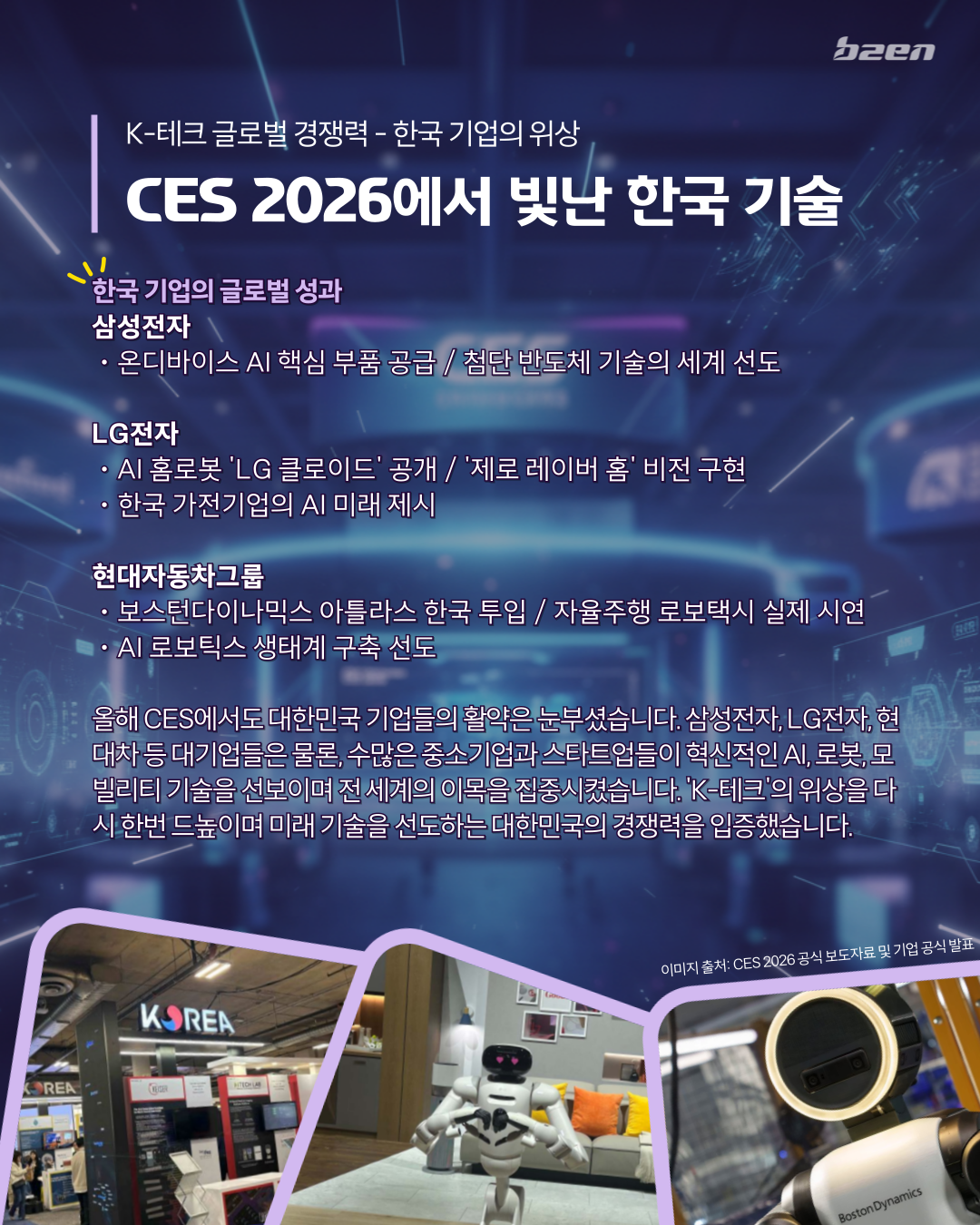 삼성전자, LG전자, 현대차 등 대기업들은 물론, 수많은 중소기업과 스타트업들이 혁신적인 AI, 로봇, 모빌리티 기술을 선보이며 전 세계의 이목을 집중시켰습니다.