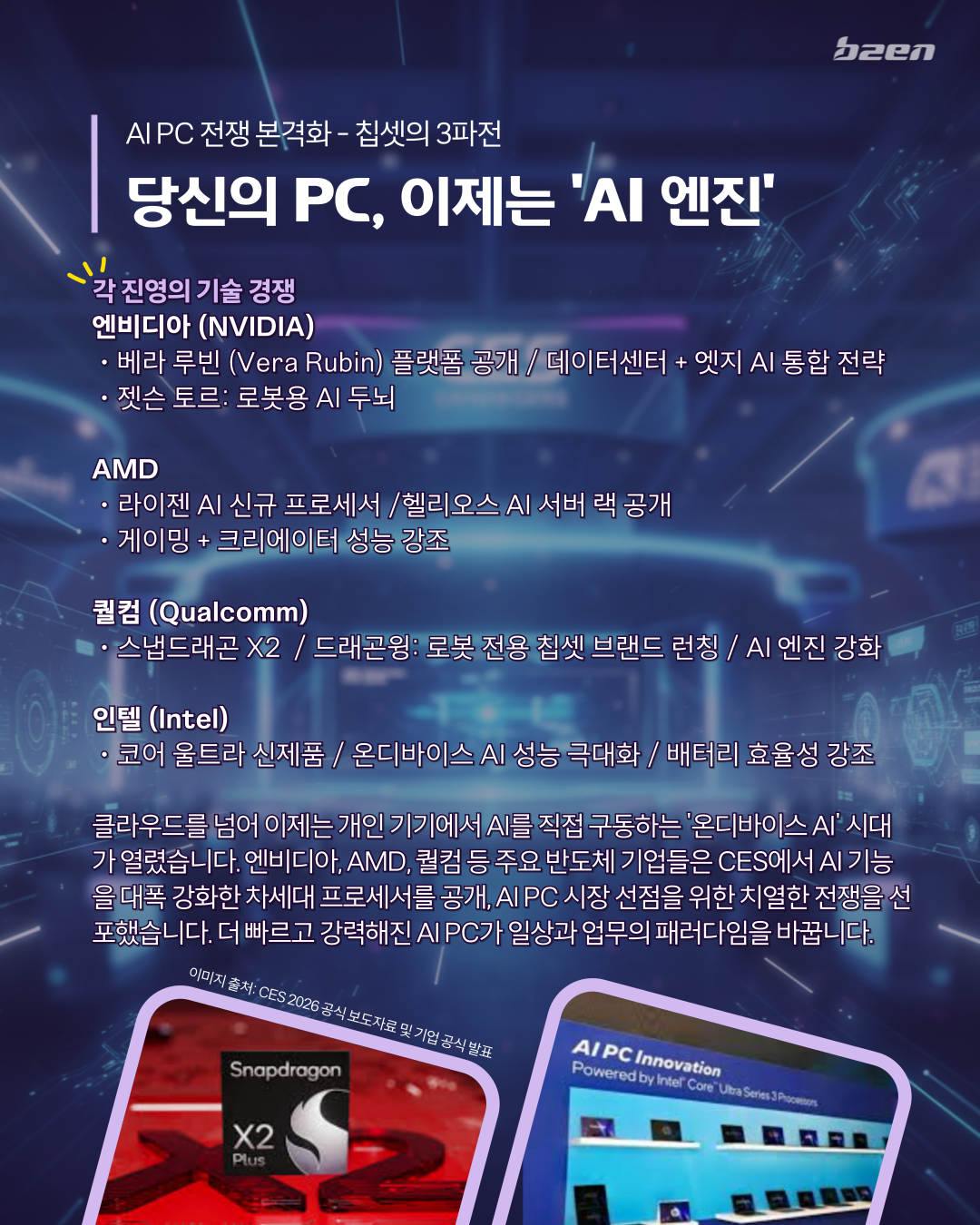 엔비디아, AMD, 퀄컴 등 주요 반도체 기업들은 CES에서 AI 기능을 대폭 강화한 차세대 프로세서를 공개, AI PC 시장 선점을 위한 치열한 전쟁을 선포했습니다.