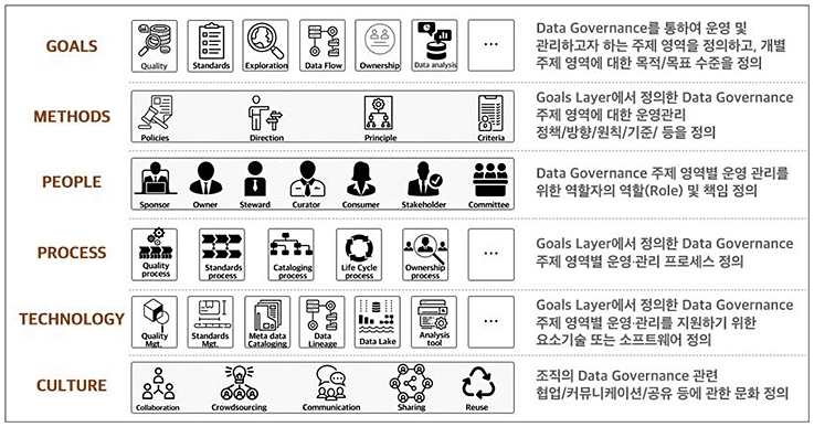 우선 Governance가 갖는 고유한 의미를 상속하여 Data Governance의 관점을 서비스 및 분석 중심, 사용자 중심으로 전환하는 것이 필요하다. 또한 Agile 방법론 기반의 프로젝트 수행을 고해야 하며, 최신의 Data Architecture 및 Technology 적용과 운영에 대한 내용이 포함되어야 한다. 그리고 체계적 데이터 관리 및 데이터 분석 활성화에 관한 조직문화에 대한 내용도 포함되는 것이 바람직하다. 최근에는 이러한 관점이 적용된 Data Governance를 Modern Data Governance로 정의하고 있다. Microsoft에서는 “Data가 모든 용도에 맞게 최적화되어 조직 및 기능에 걸쳐 더 깊은 통찰력을 제공하도록 하는 것”, Gartner에서는 “조직의 비즈니스 경쟁력 강화를 위한 강력한 도구”로 Modern Data Governance를 정의하고 있다. Eckerson Group*은 위에서 언급한 Modern Data Governance 개념이 적용된 Framework을 아래와 같이 제시한다. Framework의 Layer는 목적(Goals), 방법론(Methods), 이해관계자(People), 프로세스(Process), 기술(Technology), 문화(Culture)로 구성된다. 목적(Goals) Layer에서는 해당 조직에서 적용하고자 하는 Data Governance 구성요소를 정의하고, 하위 Layer에서는 목적(Goals) Layer에서 정의한 구성요소와 관련된 내용을 중심으로 Modern Data Governance를 정의한다.