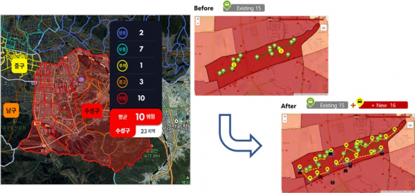 이후 안전 서비스 2.0은 ‘순찰노선 최적화’에서 ‘CCTV 최적화’로 확대되며 본격적인 분석이 이뤄졌다. CCTV 최적화 분석을 위해 우선 50m × 50m 공간격자(Grid) 단위로 도시가 얼마나 안전한지에 대한 안전도를 예측했고 안전도 점수가 다른 격자보다 높아 위험함에도 불구하고 CCTV 밀도가 적은 지역들을 추출해 분석하는 과정을 반복했다.