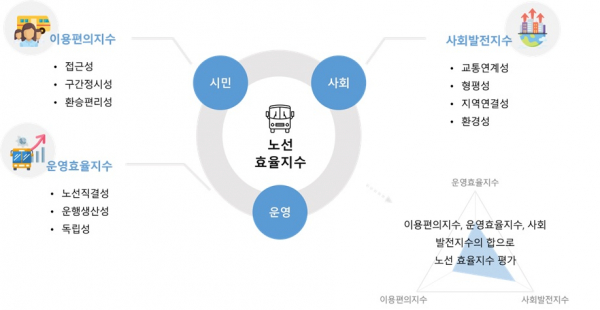 그럼에도 불구하고 버스 노선을 최적화하는데 한계는 있었다. 행정동 단위로 예측하기 때문에 노선이나 정류소 단위의 상세한 예측이 필요했고, 단순히 시민의 이용 편의 관점만 고민한 예측은 실질적인 정책 결정이 이뤄지기 어려웠다. 이를 보완하기 위해 고려해야 할 것들이 정말 많았고, 이어 버스노선 효율지수의 개념을 듣게 된 이후 해결책이 보였다. 버스노선 효율지수는 이용편의지수, 운영효율지수, 사회발전지수의 세 가지 지표의 합으로 이뤄지며, 각 지표들은 하위의 총 10개의 세부 평가항목을 구성된다.