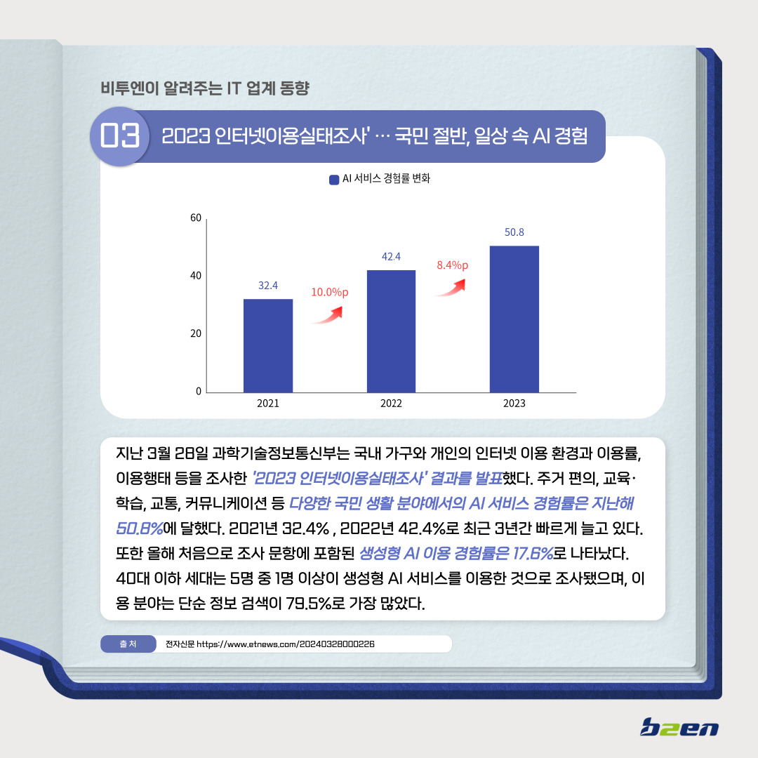 지난해는 챗GPT 등 생성형 AI 서비스의 등장으로 인터넷 생활에 큰 전환점을 맞았습니다. 주거 편의, 교육·학습, 교통, 커뮤니케이션 등 다양한 국민 생활 분야에서의 AI 서비스 경험률은 지난해 50.8%에 달했습니다. 2021년 32.4% , 2022년 42.4%로 최근 3년간 빠르게 늘고 있습니다.