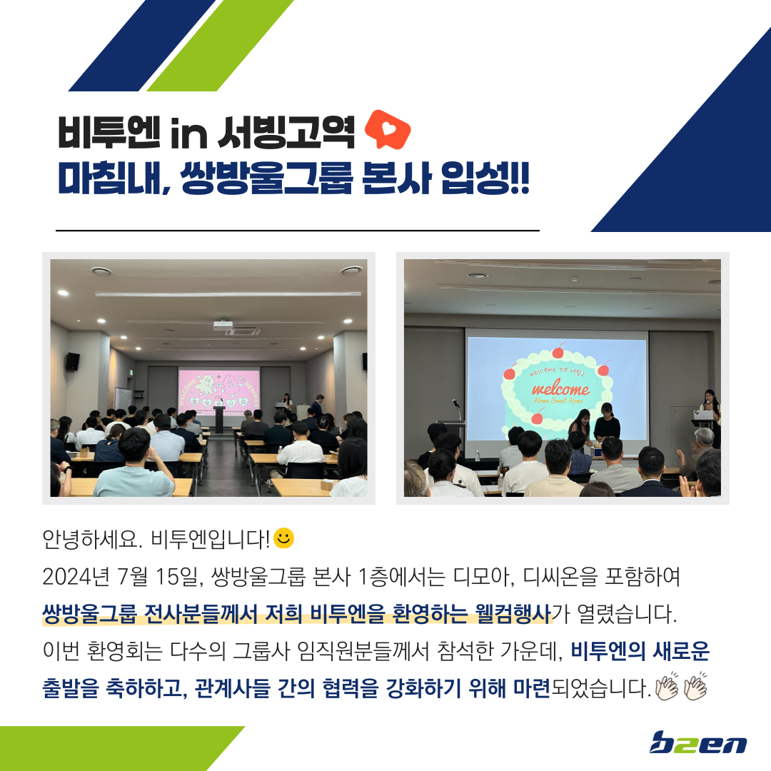 오늘 쌍방울그룹 본사 1층 세미나실에서는 비투엔을 환영하는 웰컴행사가 진행되었습니다.